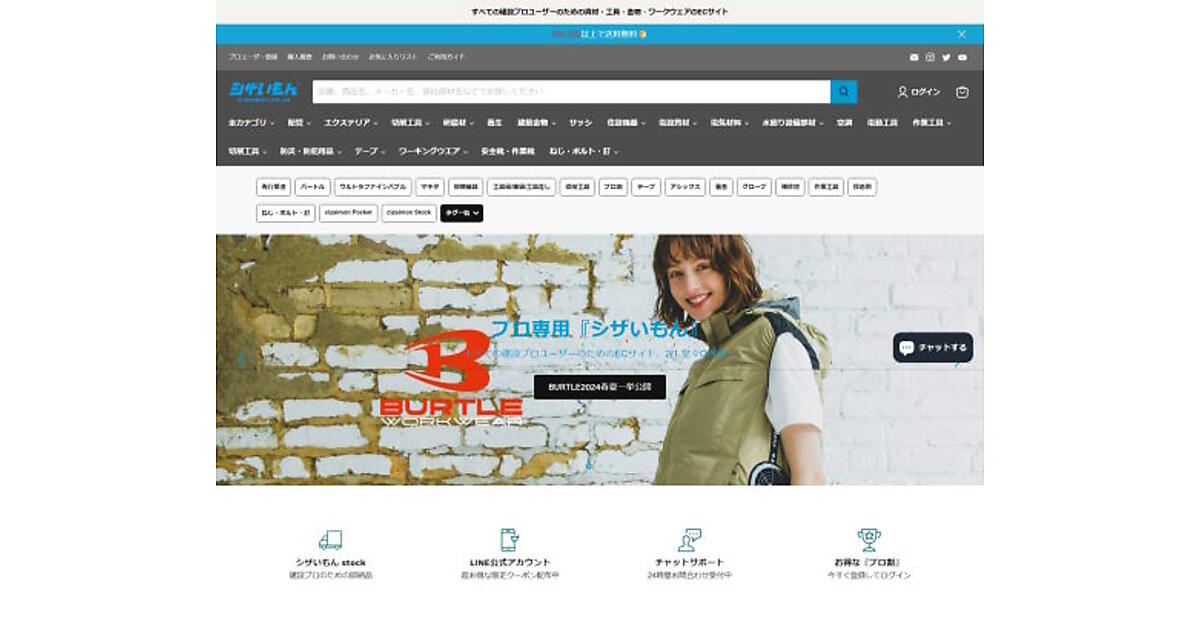 住宅・インフラ関連商材の専門商社である渡辺パイプは4月1日、建設プロユーザーのための資材・工具・金物・ワークウェアを販売する建設プロユーザー向けのECサイト「シザいもん」を開設する。