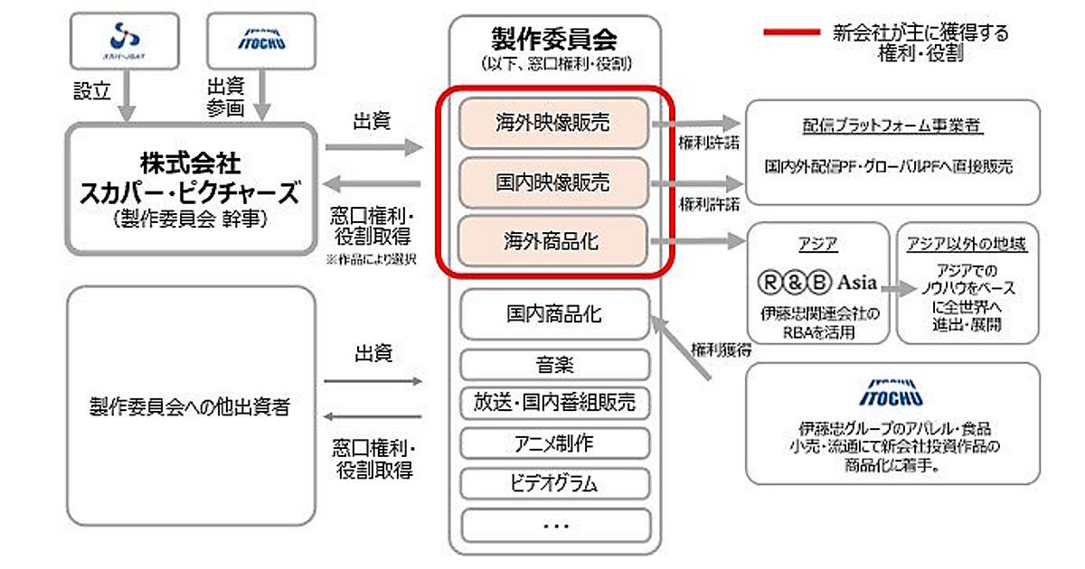 伊藤忠商事は2021年、アニメ・キャラクターのライセンス事業を手がけるRights & Brands Asia Ltd.を香港に設立。アジア圏向けの映像配信や商品化を進めてきた。スカイ・ピクチャーズへの出資を通じてアニメ事業に参入。伊藤忠グループのアパレル・食品・小売・流通にて新会社が投資した作品の商品化に着手するとしている。