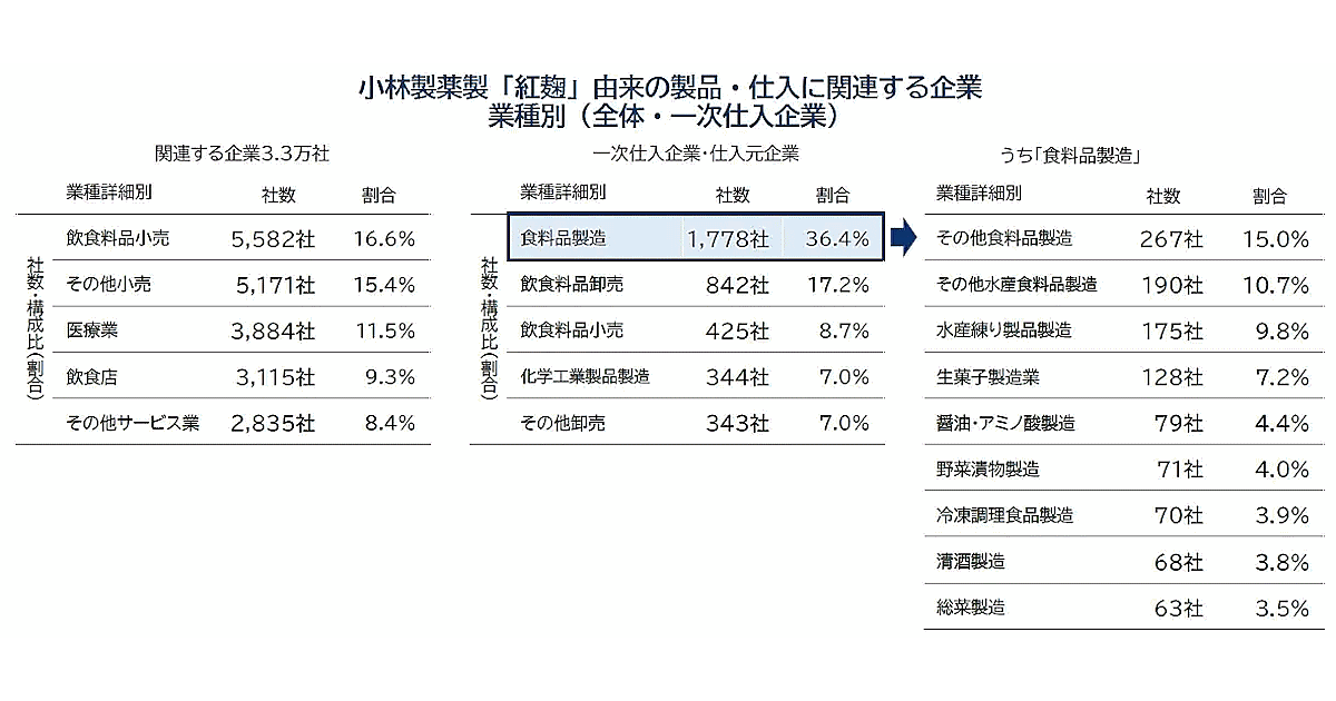 また、一次加工企業から商品の仕入・販売などといった取引関係がある「二次仕入・販売企業」は2万8775社に。「一次販売企業」に873社を合計した直接的・間接的に紅麹製品を消費者へ販売・提供している可能性のある取引企業は2万9648社に達した。