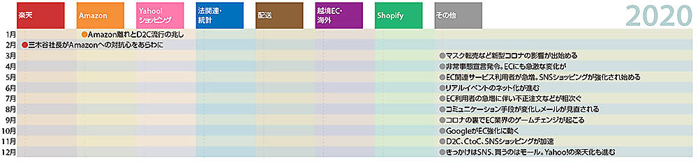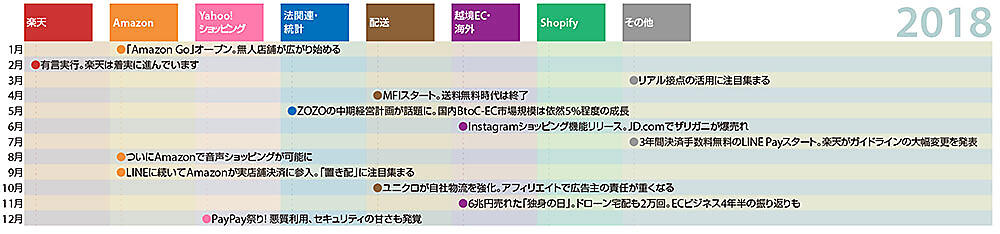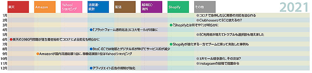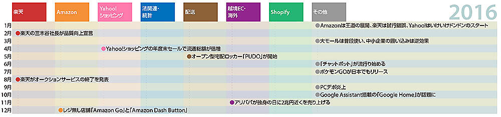 2016年からは月ごとに目立った記事を取り上げて12か月を振り返っています。「楽天」「Amazon」「Yahoo!ショッピング」「法関連・統計」「配送」「越境EC・海外」「Shopify」「その他」の8つのジャンルに分けてみました。