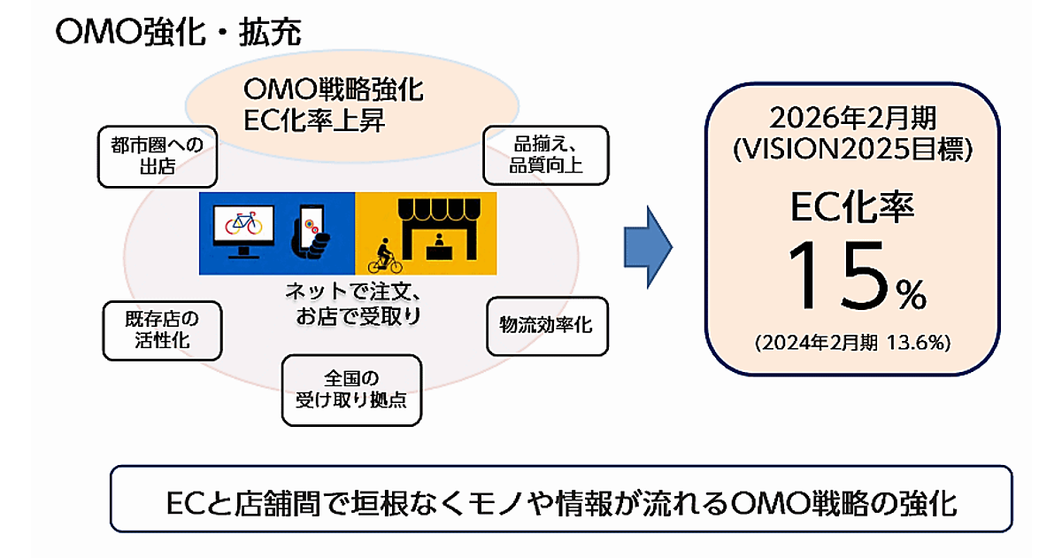 2026年2月期を最終年度とする3か年の中期経営計画(中計)「VISION2025」では、中計最終年度の2026年2月期には全社売上高850億円、EC化率15%の達成を掲げている。