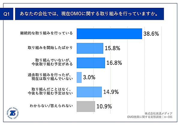 東通メディアが通販・EC事業者(経営者・役員)105人に対して実施した「OMO施策に関する実態調査」によると、OMOへの取り組みについて「継続的な取り組みを行っている」と回答した割合は38.6%だった。