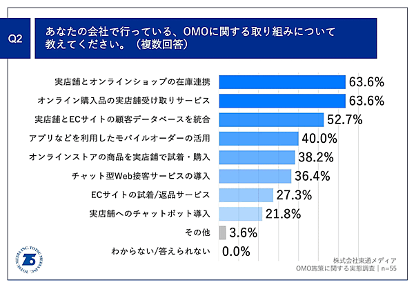 「継続的な取り組みを行っている」「取り組みを開始したばかり」と回答した経営者・役員に取り組みの内容を聞いたところ、「実店舗とオンラインショップの在庫連携」が63.6%、「オンライン購入品の実店舗受け取りサービス」が63.6%、「実店舗とECサイトの顧客データベースを統合」が52.7%だった。