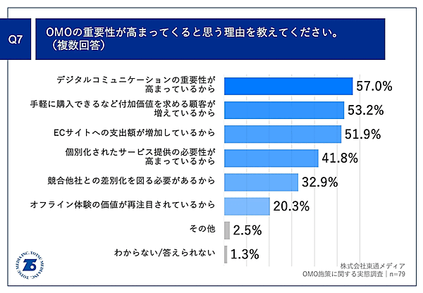 OMOの重要性の高まりについて、「非常にそう思う」「ややそう思う」と回答した経営者・役員にその理由を聞いたころ、「デジタルコミュニケーションの重要性が高まっているから」が57.0%、「手軽に購入できるなど付加価値を求める顧客が増えているから」が53.2%、「ECサイトへの支出が増加しているから」が51.9%だった。