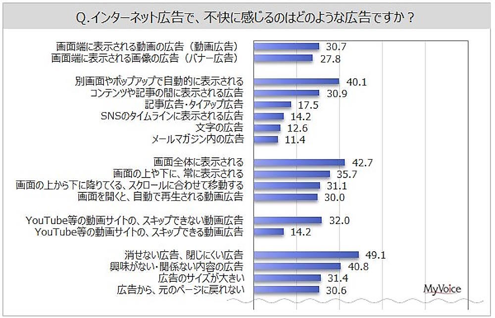 インターネット広告で不快に感じることは、「消せない広告、閉じにくい広告」(49.1%)が最多。「画面全体に表示される」(42.7%)「興味がない・関係ない内容の広告」(40.8%)「別画面やポップアップで自動的に表示される」(40.1%)もそれぞれ40%を超えており、多くのユーザーが不快に感じていることがわかる。