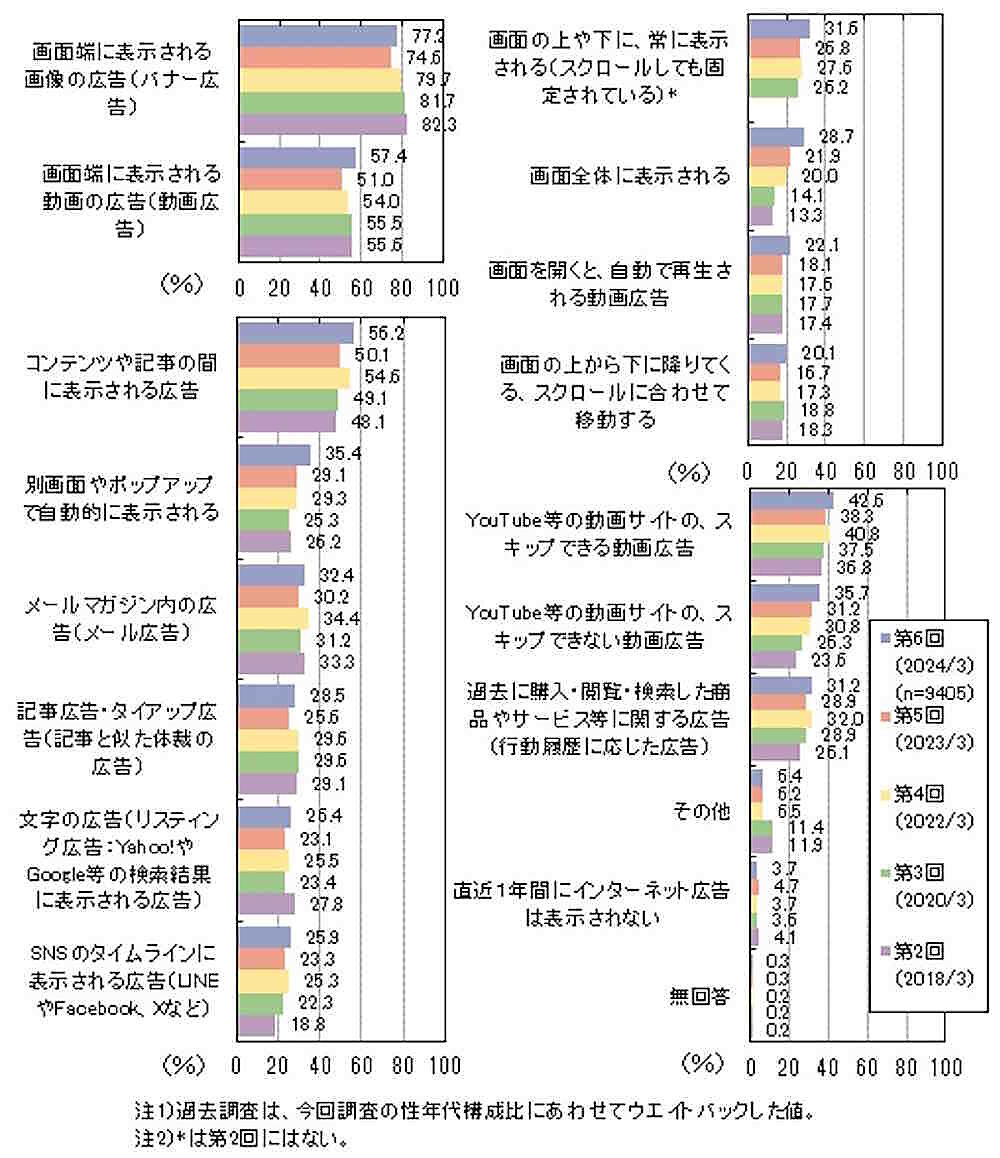 直近1年間に、インターネット利用時に表示されたインターネット広告の種類を聞いたところ、「画面端に表示される画像の広告(バナー広告)」(77.2%)が最多。次点で「画面端に表示される動画の広告(動画広告)」(57.4%)、3番目に「コンテンツや記事の間に表示される広告」(56.2%)だった。
