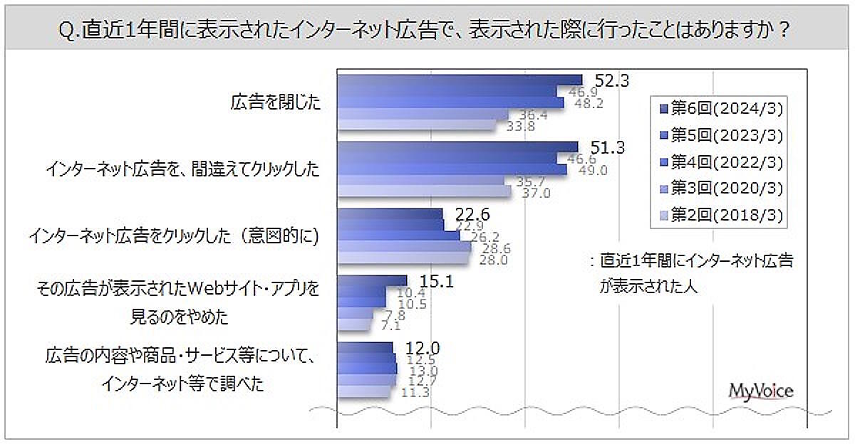 マイボイスコムが実施したインターネット広告に関するオンライン調査によると、直近1年間にインターネット広告が表示されたユーザーのうち、2割強のユーザーが意図的に広告をクリックしていることがわかった。調査の実施期間は2024年3月1~5日、回答者数は9405人。
