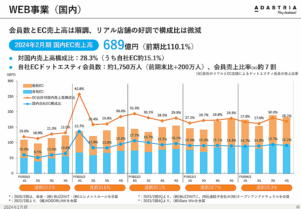 国内売上高のうちEC売上高が占める比率(EC化率)は28.3%。「ドットエスティ」の売上比率は約15.1%だった。会員数は前期末比約200万人増の約1750万人。自社のリアルとEC店舗による「ドットエスティ」会員の売上比率は約7割となっている。