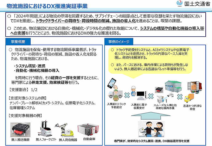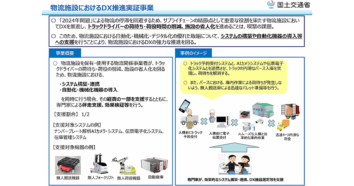 国土交通省は、物流施設における自動化・機械化・デジタル化の優れた取り組みに補助金を交付する「物流施設におけるDX推進実証事業費補助金」の募集を開始した。応募期間は4月3日から19日まで。