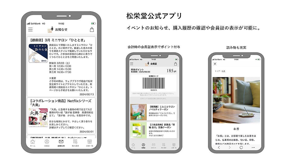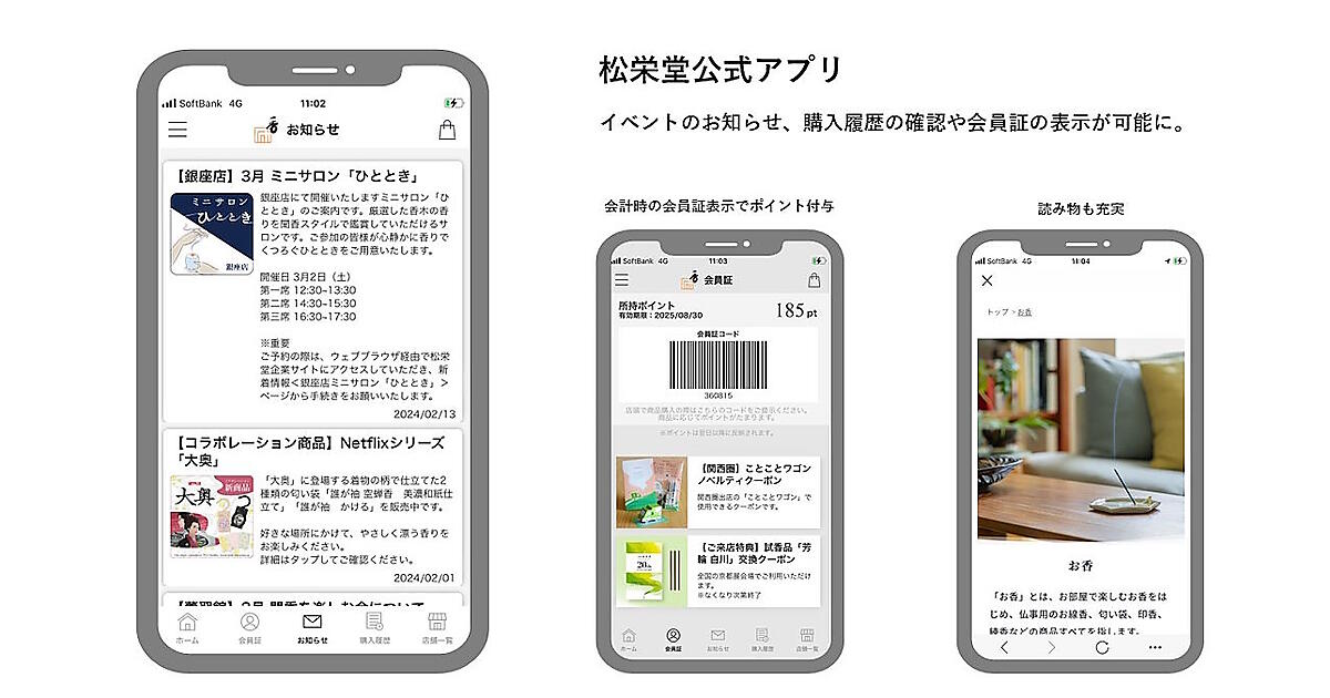 松栄堂における公式アプリの特徴は2点。1つ目が、店舗・ECにおける新商品やイベントの告知を確認することができること。季節に合わせたお薦めの香りを試せる「香りにであう会」、厳選した香木を聞香スタイルで聞くことができるミニサロン「ひととき」など、リアルで実施する催しへの案内・告知を行い、イベントへの集客を増やしている。