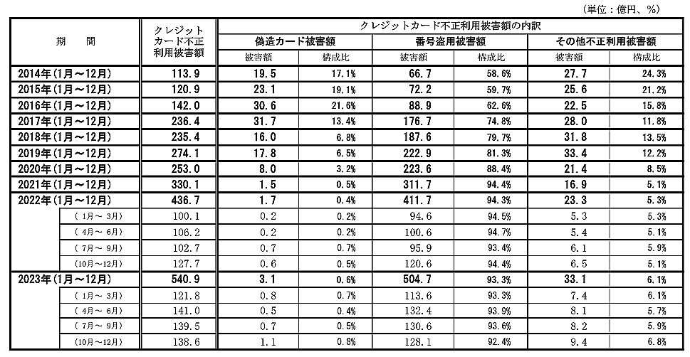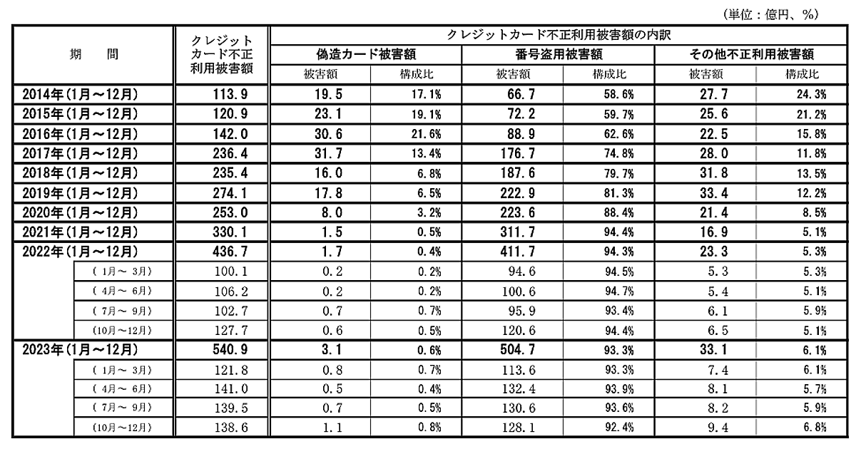 一般社団法人日本クレジット協会が実施しているクレジットカード発行不正利用被害実態調査によると、2023年の不正利用被害額は前年比23.9&増の540億9000万円だった。被害額は前年実績(436億7000万円)を104億2000万円上回り過去最大の被害だった。