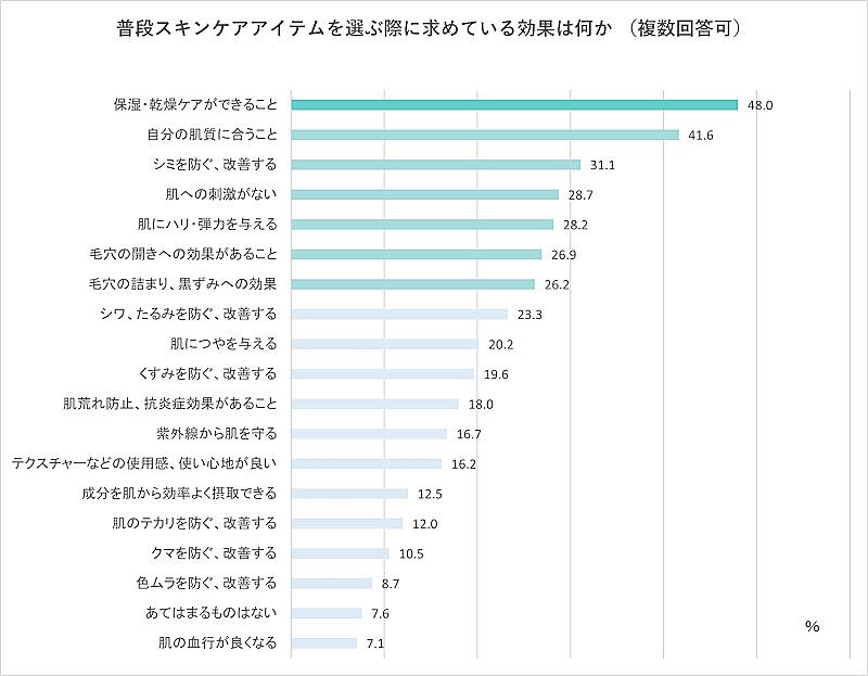 スキンケア商品を選ぶ際に求めている効果については、「保湿・乾燥ケアができること」(48.0%)が最も多く、シミやハリ、毛穴に対するケアを求めるユーザーが多い。「自分の肌質に合うこと」(41.6%)「肌への刺激がない」(28.7%)も上位にあがっており、特定の効果以外の特徴も消費者から重視されている。