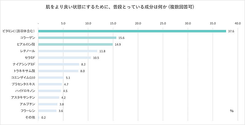 肌をより良い状態にするために摂取している成分を聞いた質問では、「ビタミンC」(37.6%)と答えたユーザーが最も多かった。ビタミンCは安全性が高く、メラニン合成の阻害や、皮脂分泌の抑制など、幅広い肌悩みに対応することから、不動の人気となっている。