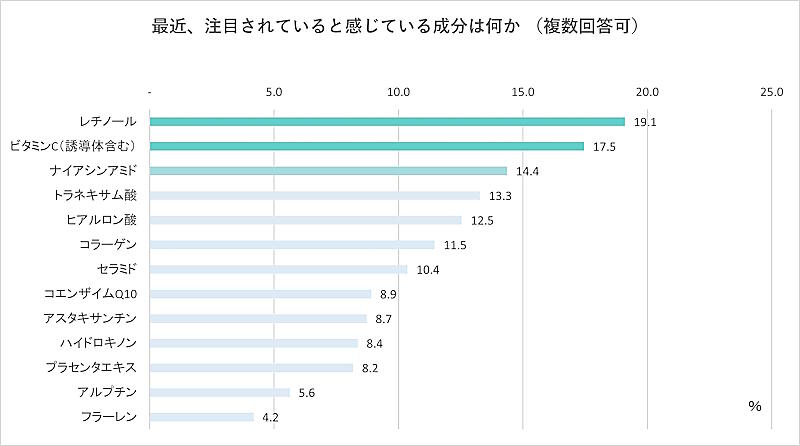 注目されていると感じている成分を聞いたところ、「レチノール」(19.1%)が最多で、「ビタミンC」(17.5%)「ナイアシンアミド」(14.4%)と続いた。