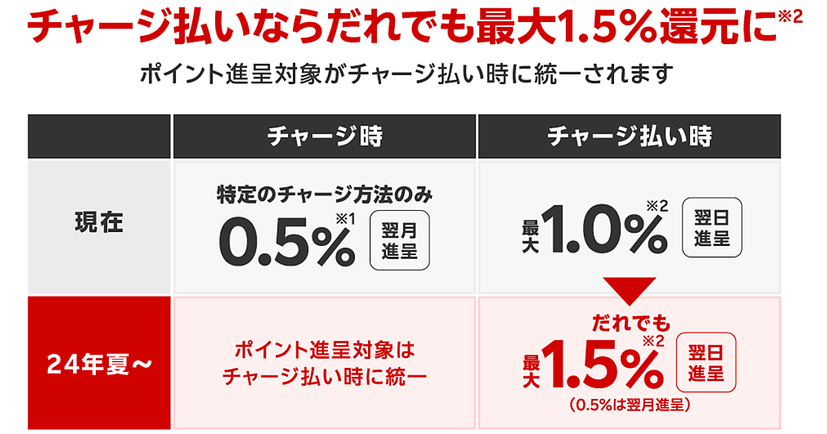 新ポイント還元プログラムでは、どのチャージ方法から「楽天キャッシュ」にチャージした場合でも、「楽天ペイ」アプリによる「楽天キャッシュ」でのコード・QR払い時に最大1.5%のポイントを付与する。