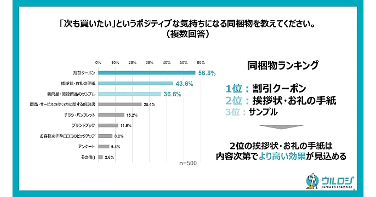 次も商品を買いたくなる同梱物の内容は、1位が「割引クーポン」で56.8%、次が「挨拶状・お礼の手紙」で43.6%、3位は「新商品・関連商品のサンプル」の36.6%だった。