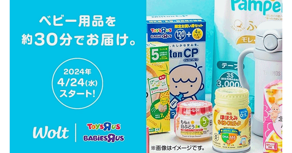 「Wolt」の専用アプリまたはWebサイトから申し込みを受け付け、受注後約30分で商品を届ける。「ベビーザらス」で扱う、おむつやおしりふき、粉ミルク、ベビーフード、哺乳瓶、ベビーソープなど、ベビー用品約1600アイテムをラインアップした。