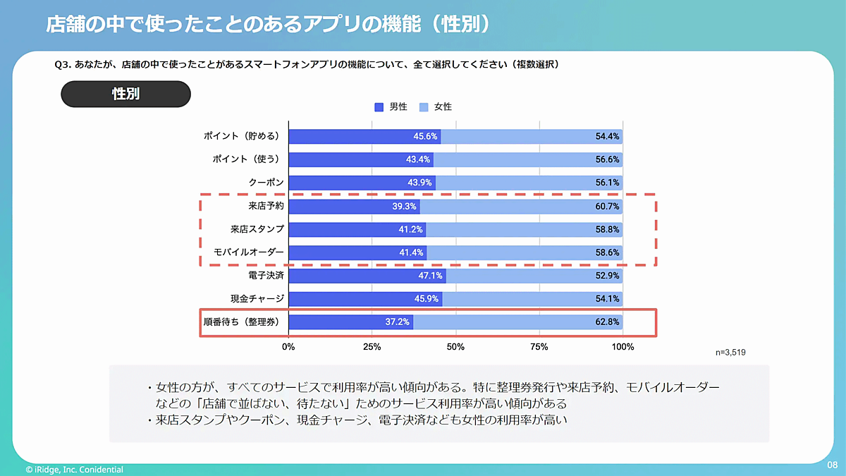 「来店スタンプ」(58.8%)や「クーポン」(56.1%)、「現金チャージ」(54.1%)、「電子決済」(52.9%)なども女性の利用率が高かった。