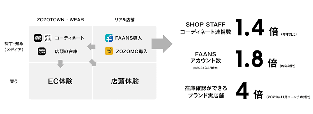 1人あたりの購買頻度向上では、「ZOZOTOWN」、ファッションECアプリ「WEAR」の進化、ショップスタッフによるコーディネート連携数の充実(前年比1.4倍)、「ZOZOTOWN」で販売展開するショップスタッフの販売サポートツール「FAANS」のアカウント数拡大(同1.8倍)、在庫確認ができるブランド実店舗(2021年11月のローンチ時比較で4倍)などを計画している。