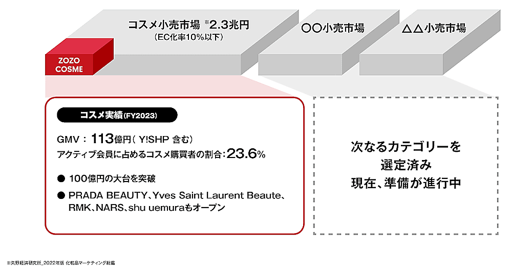 コスメ事業(ZOZOOSME)は2024年3月期に商品取扱高が「Yahoo!ショッピング」店を含めて113億円、アクティブ会員が占めるコスメ購買者の割合が23.6%に達した。ドラッグストア系のコスメブランドや韓国コスメブランの出店誘致、日替わりキャンペーンの実施などで、定期的に「ZOZOCOSME」でコスメを購入する仕組みの構築をめざす。
