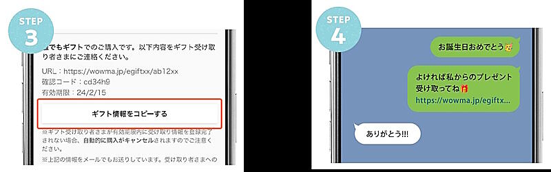 - 購入完了後に送られるメールまたは購入詳細画面の「ギフト情報をコピーする」からギフト情報(URL・確認コード・有効期限)を取得