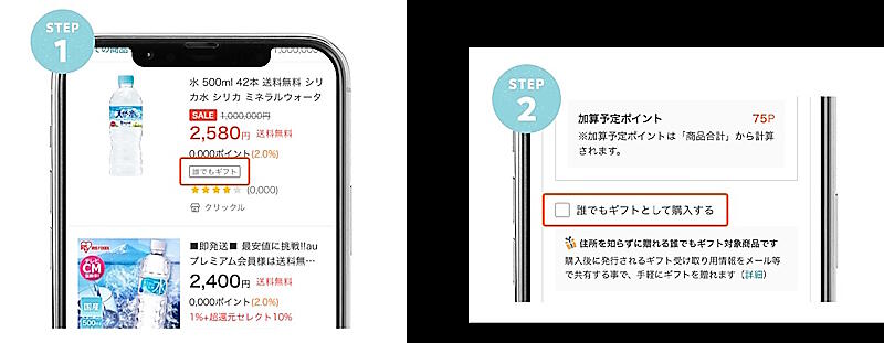 - 「誰でもギフト」ラベルの付いた対象商品を選択し、オンライン上の買い物かごに入れる