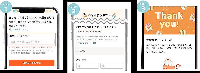 「誰でもギフト」の購入からギフト贈呈までの手順は次の通り。
