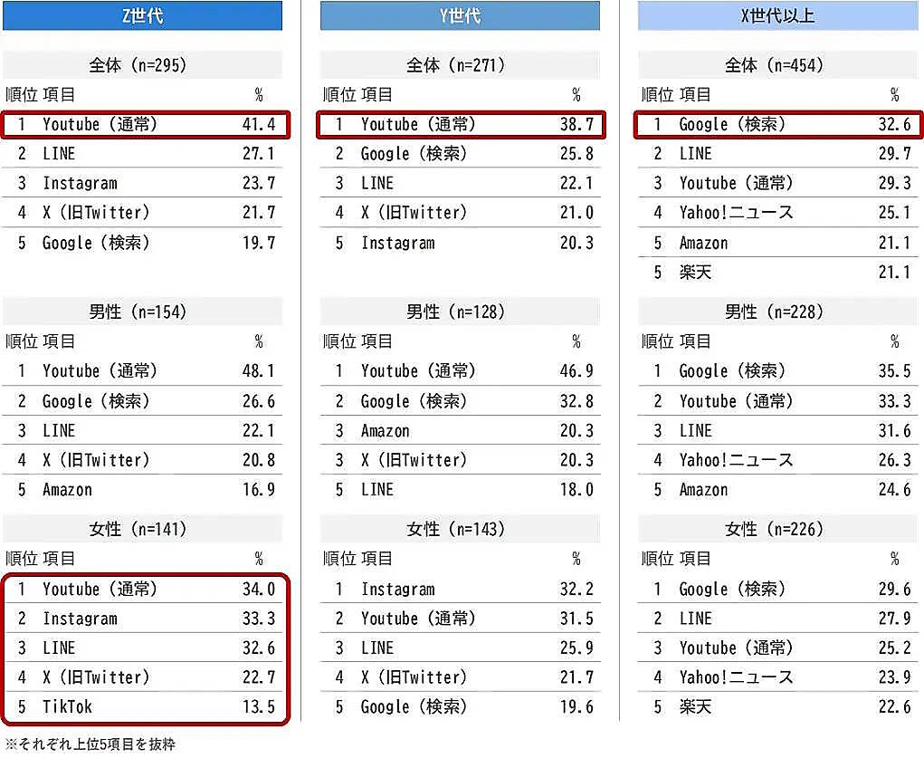 利用頻度が高いサービスを3つ選択してもらったところ、Z世代は「YouTube」(41.4%)、「LINE」(27.1%)、「Instagram」(23.7%)。Y世代は「YouTube」(38.7%)、「Google」(25.8%)、「LINE」(22.1%)。X世代は「Google」(32.6%)、「LINE」(29.7%)、「Youtyube」(29.3%)。