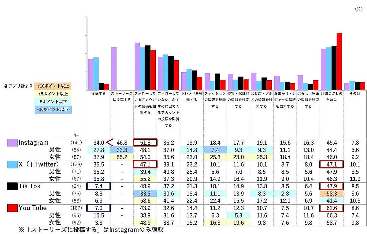 Z世代に各SNSの利用について訊いたところ、「Instagram」はフォローしているアカウントの投稿を閲覧するが51.8%で最多。「X」はアカウントの投稿閲覧、暇つぶしが各47.1%だった。ストーリーズへの投稿は46.8%。「TikTok」「YouTube」は「投稿する」の選択率が他のSNSと比較して大幅に低い。