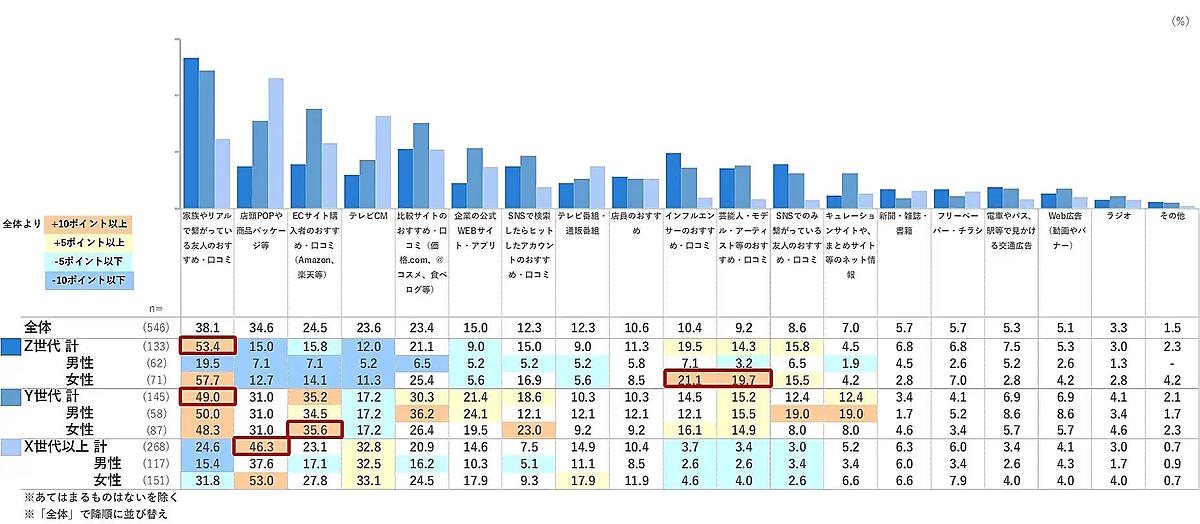 X世代は「店頭POPや商品パッケージ等」が46.3%で最多。Y世代の女性は「ECサイト・購入者のおすすめ・口コミ」が35.6%で最も多く、Z世代の女性においては、「インフルエンサーのおすすめ・口コミ」が21.1%、「芸能人・モデル・アーティスト等のおすすめ・口コミ」が19.7%だった。