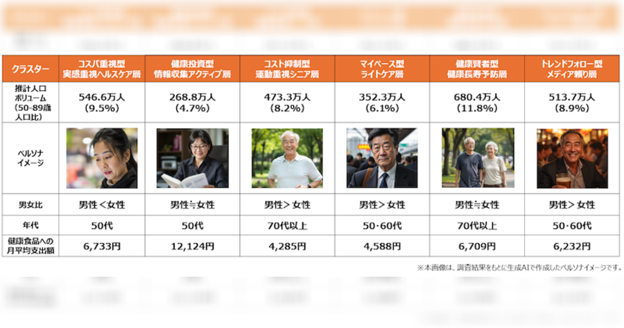 シニア世代の健康食品購買、通販・ECで狙うは「健康賢者型 健康長寿予防層」「健康投資型 情報収集アクティブ層」 調査では独自のクラスター分析により、健康食品を利用するシニア層を画一的に捉えるのではなく、健康意識や消費行動が異なる6つのタイプに分類した。