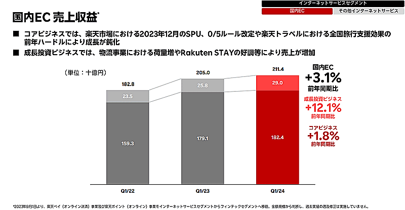 国内ECの売上収益は前年同期比3.1%増の2114億円、Non-GAAP営業利益は前年同期比2.7%増の215億円。売上収益については流通総額と同様の要因で成長が鈍化、一方で成長投資ビジネスは前年同期比12.1%増となり、物流事業における荷量増やRakuten STAYの好調が売り上げ増をけん引したとしている。