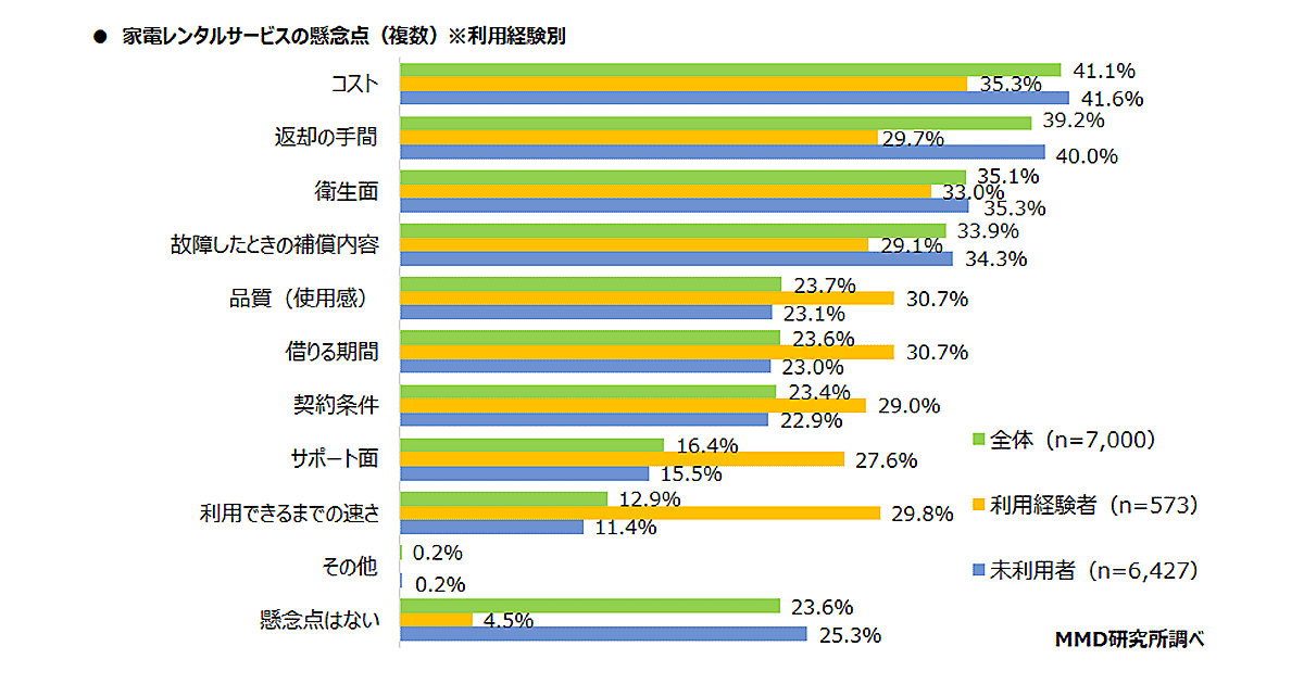 家電レンタルサービスの懸念点の最多は「コスト」(41.1%)で、次いで「返却の手間」(39.2%)「衛生面」(35.1%)だった。