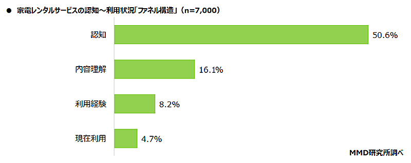 調査対象者に家電レンタルサービスについて聞いたところ、「認知」は50.6%、「内容理解」は16.1%、「利用経験」は8.2%、「現在利用」は4.7%だった。