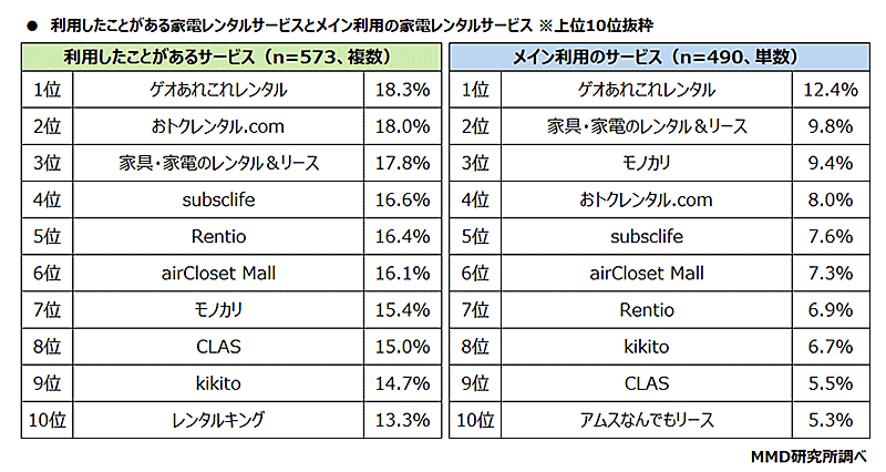 利用経験がある家電レンタルサービス上位は「ゲオあれこれレンタル」「おトクレンタル.com」