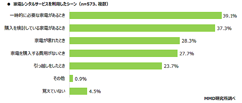 家電レンタルサービスを利用したシーンの最多は「一時的に必要な家電があるとき」(39.1%)。「購入を検討している家電があるとき」(37.3%)「家電が壊れたとき」(28.3%)と続いた。