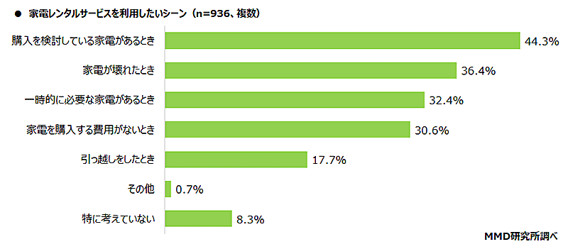 家電レンタルサービス未利用で「今後利用したい」と回答したユーザーに、家電レンタルサービスを利用したいシーンを聞いたところ、「購入を検討している家電があるとき」(44.3%)が最も多く、次いで「家電が壊れたとき」(36.4%)「一時的に必要な家電があるとき」(32.4%)だった。