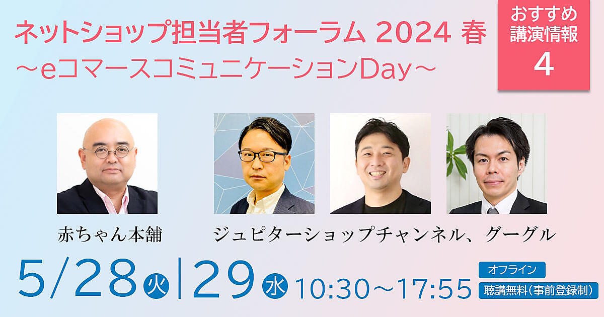 5月28日(火)+29日(水)に開催する「ネットショップ担当者フォーラム 2024 春」(東京・渋谷でオフライン開催)には、赤ちゃん本舗、ジュピターショップチャンネル、グーグル、ユナイテッドアローズ、シップスといった企業が登壇。「リアルとECの融合施策」「データ活用」「アパレルECの戦略と展望」などのテーマについて、企業の責任者などが講演します。25講演すべて無料で聴講できます。
