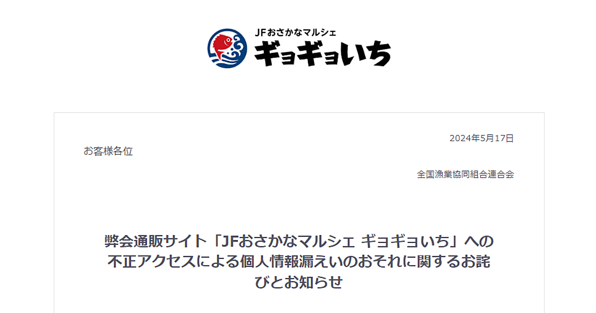 警視庁から5月14日、JF全漁連のECサイト「JFおさかなマルシェ ギョギョいち」のプログラムの一部改ざん、会員登録およびサイト利用者の個人情報漏えいの懸念があるとの連絡を受け、同日にECサイトを停止した。不正サクセスによるプログラムの一部改ざんによって、顧客の入力情報を不正に入手できるようにした疑いが原因だという。
