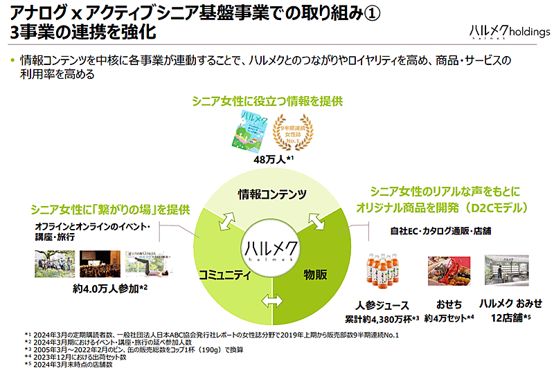 「ハルメク事業」は、シニア向け雑誌「ハルメク」の出版で顧客を獲得、雑誌に共感した顧客に対して、特集連動のオリジナル商品などを、同封して送付するカタログ通信販売で提案・販売する。また、イベント部門が講座や旅行などを提供し、顧客の満足度を高めるとともに収益を伸ばしている。書店では購入できない雑誌「ハルメク」は自宅へ送付する定期購読のみで展開。2024年3月時点での購読者数は48万人を超える読者を抱える。