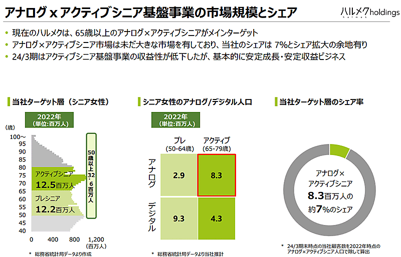 ハルメクHDの推計では「アナログ×アクティブ」シニアは830万人いるとし、ハルメクの推計シェア率は約7%。「基本的に安定成長・安定収益ビジネス」(ハルメクHD)で、拡大の余地はまだあるとし、基盤事業として中期的な安定成長をめざしている。