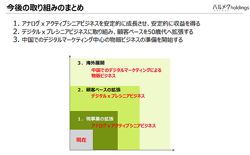 長期的な課題としてシニアがアナログからデジタルへ徐々に移行していることもあり、基盤となっているアナログ×アクティブシニアは減少していく領域であるとハルメクでは見込んでいる。そのなかで、ハルメクは50歳代の「プレシニア」を主たる顧客としてデジタル事業に先行投資し、事業基盤を整える。