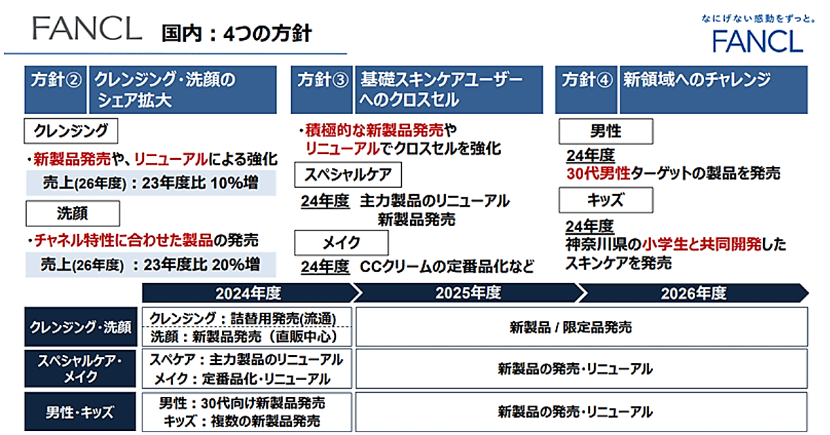 ファンケルが策定した第4期中期経営計画(2024~2026年度)は「再興2026」と銘打ち、化粧品・健康食品それぞれ新たな層の開拓やCRM変革、中国・ASEANなど海外展開の強化などに取り組む。