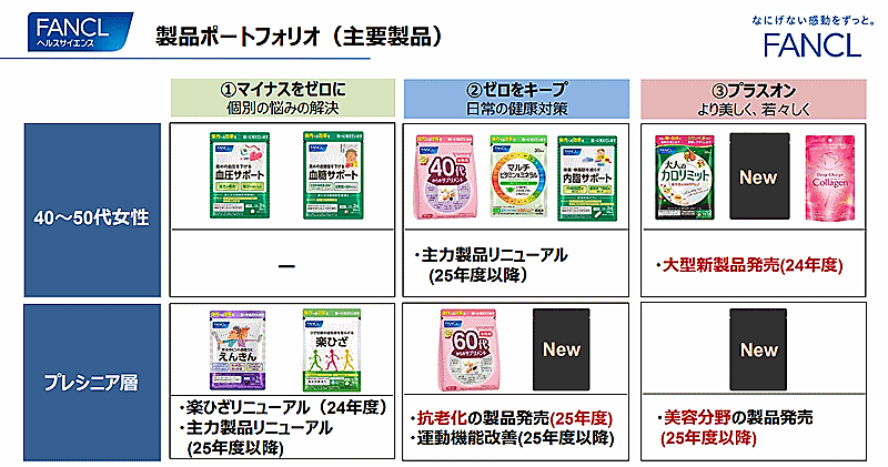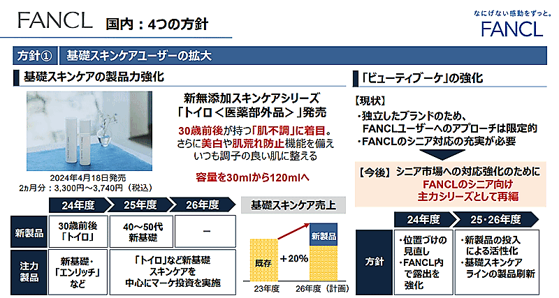シニア向けには独立ブランドの既存製品である「ビューティブーケ」を、ファンケルのシニア向け主力シリーズとして再編する。2024年4月には医薬部外品である30歳前後の肌不調に着目した新無添加スキンケアシリーズ「トイロ」をリリース。2026年3月期中には40~50代向けの新基礎化粧品を用意する。来期から新商品郡を中心としたマーケ投資を実施していく。