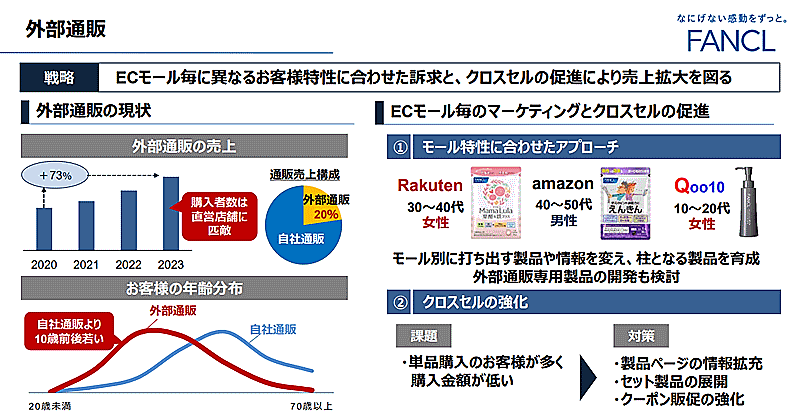 外部通販の売り上げ構成は通販売り上げの2割を占めるまでに成長。購入者数としては直営店舗に匹敵しているという。主要なモール内でのマーケティング強化とクロスセルで、新規顧客との接点拡大および売上拡大を図る。