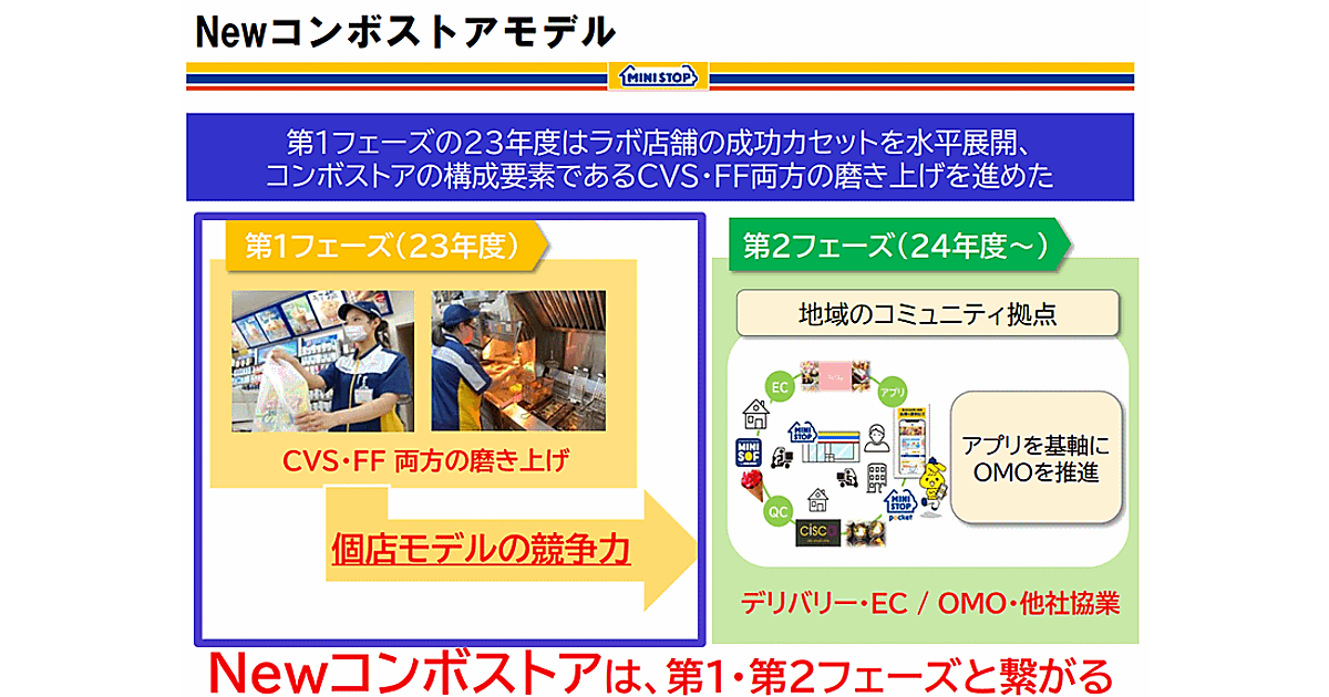 「コンボストア」とは、コンビニエンスストア(CVS)とファストフード(FF)店を融合させた業態を表すミニストップの造語。2023年度を第1フェーズとしてCVS・FFのサービス競争力強化を進めた。2024年度(2025年2月期)からは第2フェーズとしてミニストップアプリを軸としたOMO推進を図る。