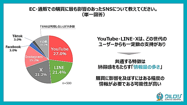 通販・ECでの買い物に最も影響があったSNSは、「YouTube」がトップで27.0%、2位が「LINE」で21.4%、3位は「X」の21.2%。「Instagram」は15.2%で4位だった。