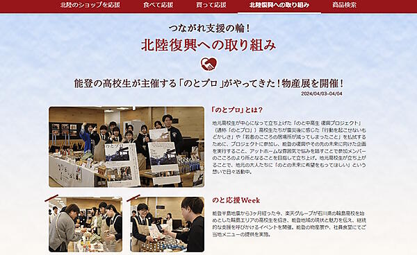 そのほか、「北陸復興への取り組み」として楽天グループが4月に石川県立輪島高等学校などの高校生を都内・世田谷の本社に招いて実施した支援イベント「のと応援Week」の様子なども紹介。能登の特産品を販売する物産展を実施し、被災地域の高校生が楽天の従業員に向けて特産品の魅力や、被災地域の現状を伝える活動を行った。
