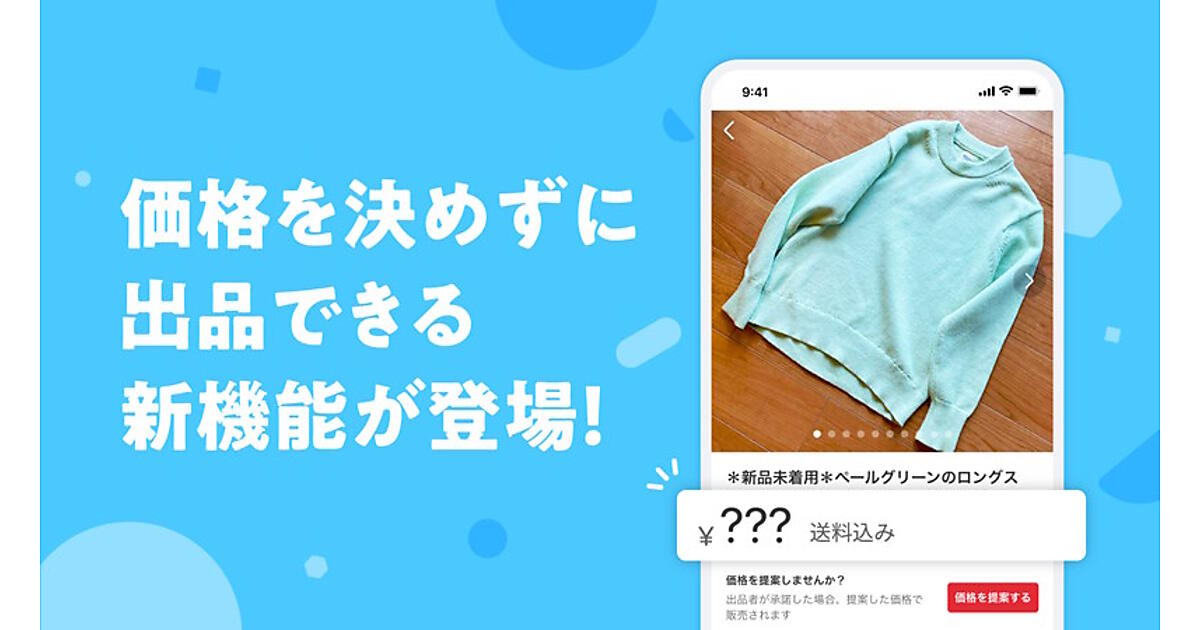 メルカリは5月22日、フリマアプリ「メルカリ」で商品価格を決めずに出品できる「価格なし出品」機能を開始すると発表した。価格なしで出品した商品は購入者側が価格提案でき、出品者が提案価格を承諾するとその価格で販売できる。