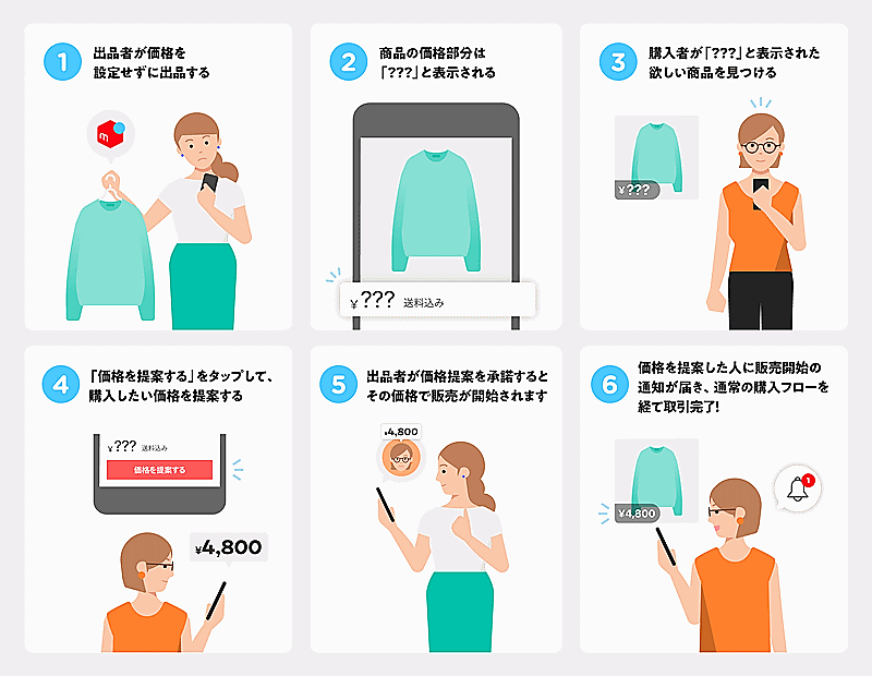 価格なしで出品された商品の価格欄は「???」と表示する。価格なし商品を購入を希望するユーザーは、商品ページ内に表示される「価格を提案する」ボタンから購入希望価格を提案できる。価格提案があると出品者には通知が届き、承諾すると提案された価格が商品価格として反映され通常と同様の販売が開始される。通常の販売がスタートとなるため、必ずしも価格提案を行ったユーザーが購入できることを保証するものではないとしている。